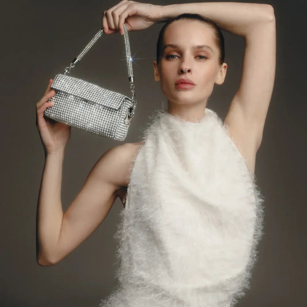 Step into the spotlight with Diamorelle Silver, the ultimate silver crystal handbag that has redefined elegance. Loved by celebrities and celebrated as a timeless classic, this crystal bucket bag is designed for fashion-forward women who refuse to compromise on style.